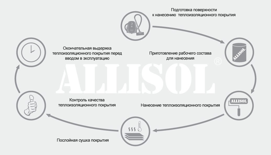 Технологический процесс получения теплоизоляционного покрытия на основе спецсостава «ALLISOL®» состоит из следующих последовательно выполняемых операций: .